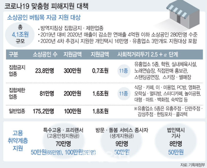 정부에서는 이번에 코로나 3차 확산으로 인해 생계에 어려움을 겪고있는 소상공인 그리고 자영업자 분들에게 총 9조 3000억 규모의 3차 재난 지원금을 최대 300만원을 지원해 준다고 합니다.