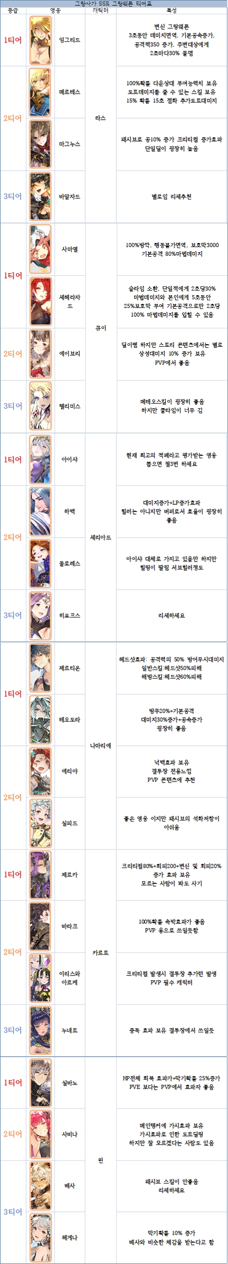 그랑사가 출시 이후 많은 분들이 티어, 등급표를 찾고 계십니다. 현재 CBT 등급표가 많이 돌아다니고 있는데 출시 이후 개인적으로 써본것과 여러 사람들의 의견을 들어 만들었으니 확인해 보시기 바랍니다.